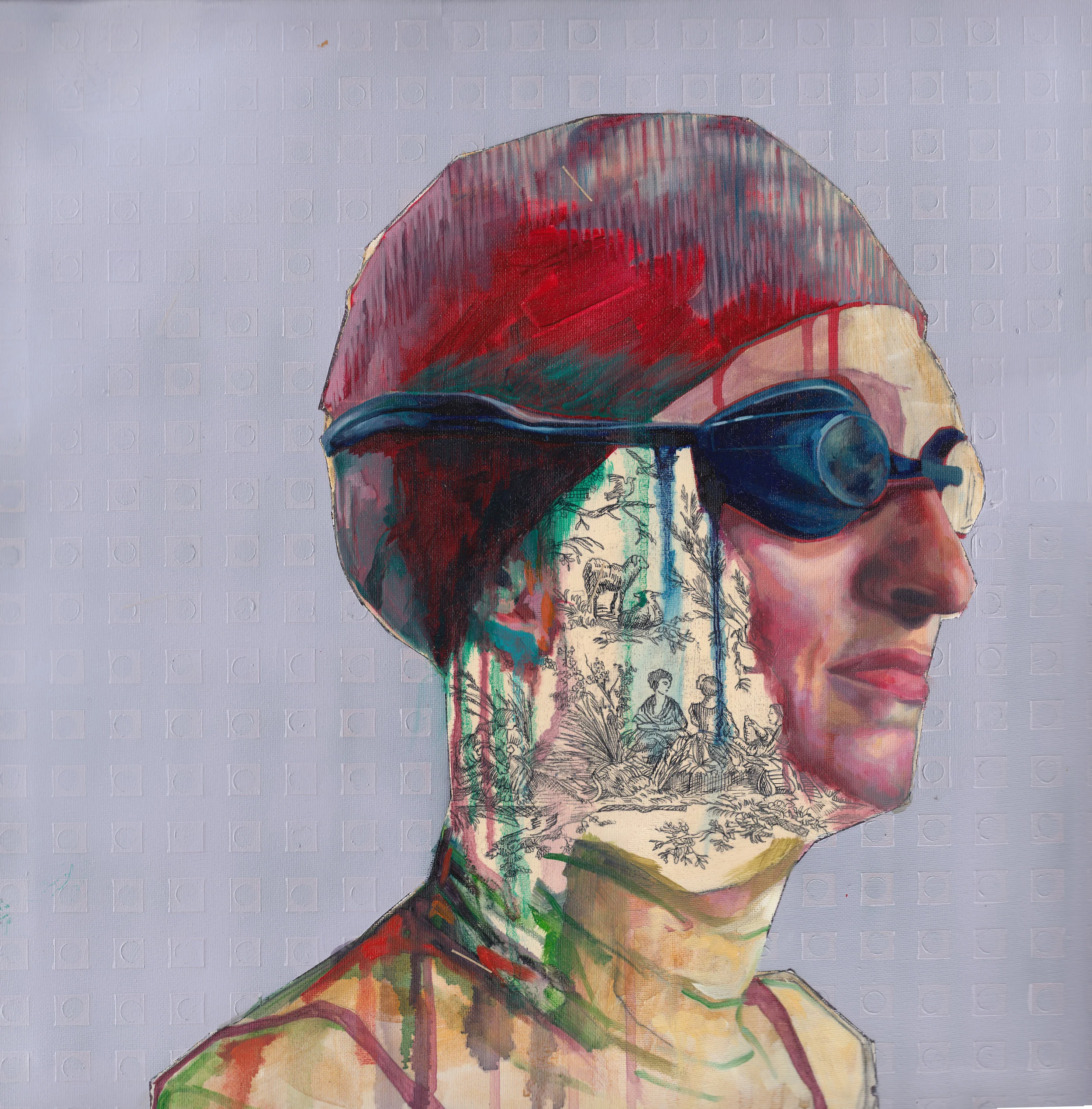 Figure With Toile de Jouy | oil, acrylic, aerosol, pen & ink on canvas | 20 x 20 in. (SOLD)