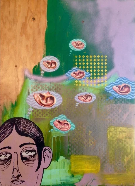 Figure In Motion, 9 Ears, 5 Sets of Goggles (triptych) | oil, acrylic, aerosol on canvas | 72" x 24".